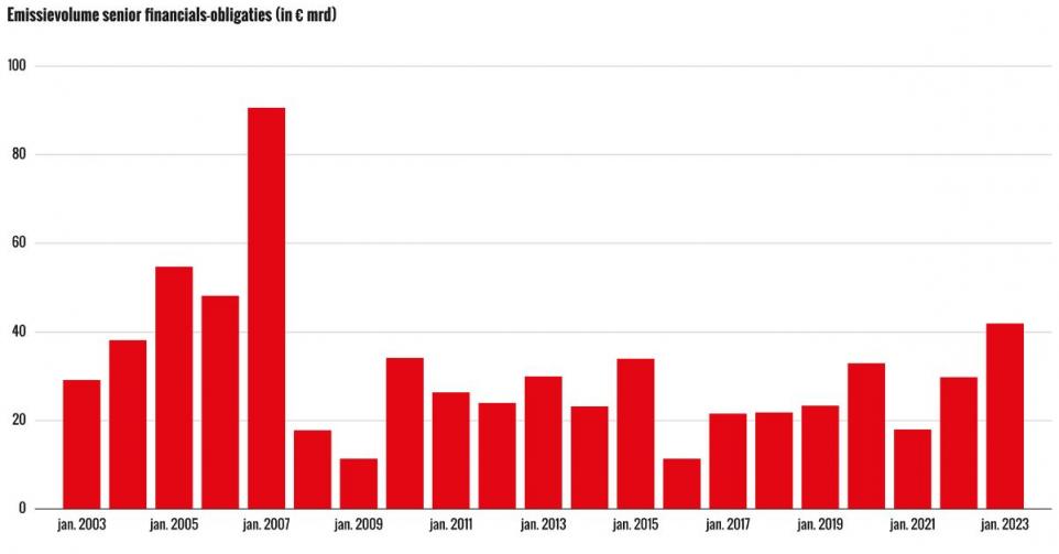 Maar vooral de in euro’s uitgegeven leningen van banken en verzekeraars zijn niet aan te slepen. Deze markt kende volgens strategen van Société Générale een ‘fenomenale week’ waarin maar liefst 28 nieuwe leningen voor een bedrag van in totaal €25,4 mrd werden geplaatst. Daarmee komt het totaal voor de eerste twee weken van januari op €41,9 mrd. Dat is nu al de beste januari sinds 2007. Het effectief rendement op de iBoxx Euro Financials Index is dit jaar dit met 37 basispunten gedaald tot 4,35% tegen 0,85% in januari 2022.