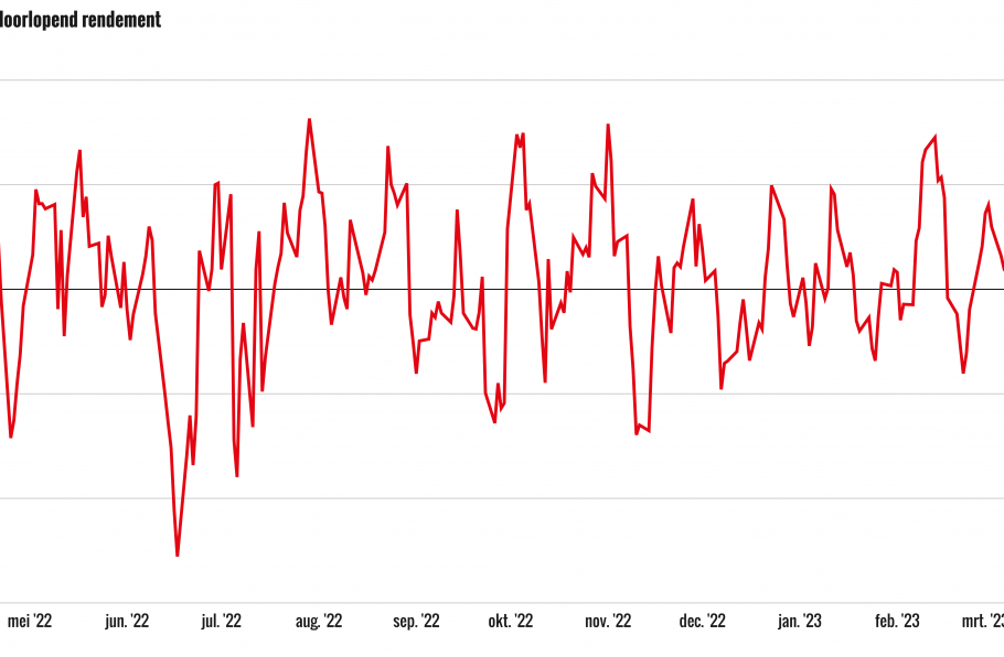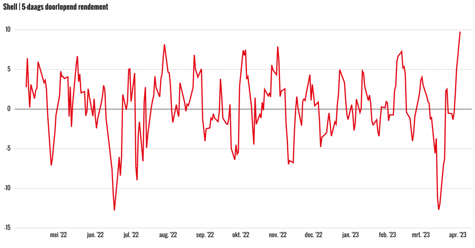 In bijgaande grafiek staat het doorlopende rendement van aandelen Shell over een periode van vijf dagen. Over de vijf handelsdagen eindigend op maandag 3 april is de koers van Shell gestegen met 9,7%.