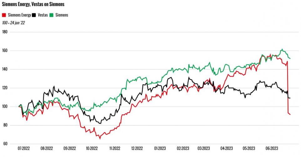 De kosten voor oplossen van deze kwaliteitsproblemen schat Siemens Energy op liefst €1 mrd. Dat leidde tot het intrekken van de winstprognose en de daarop volgende koersval van liefst 37%. Het aandeel van de Deense concurrent Vestas van Siemens Gamesa kreeg vrijdag een tik mee van deze winstwaarschuwing en verloor 6,6%.