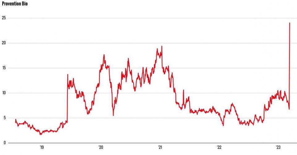 De koers van het aandeel Provention Bio steeg naar de allerhoogste stand ooit. Het bedrijf wordt overgenomen door de Franse farmaceut Sanofi.