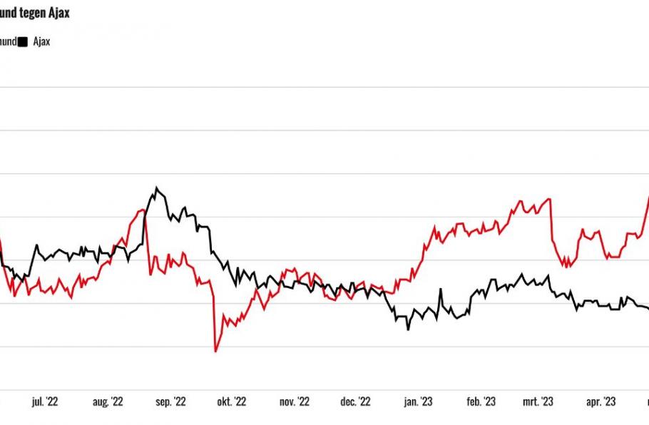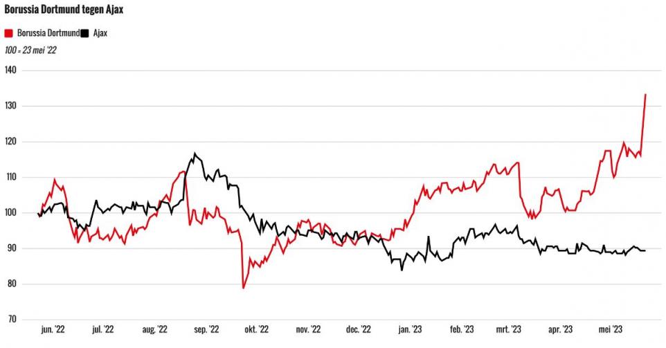 Over de afgelopen twaalf maanden heeft Borussia Dortmund het duidelijk beter gedaan dan het enige Nederlandse beursgenoteerde voetbalbedrijf, Ajax, dat medio mei ‘vierde’ dat het 25 jaar aan de Amsterdamse beurs is genoteerd.