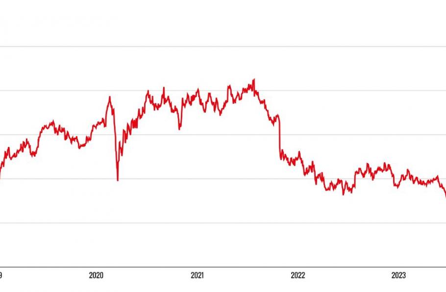 De halvering van vorige week naar de laagste stand ooit, kwam na al een glijbaan sinds de hoogste stand in de beurshistorie van het aandeel eind juli 2021. In ruim twee jaar had de financiële dienstverlener eind vorige week 86,3% van haar koerswaarde verloren en daarmee was Worldline gedurende deze periode het zwaarst afgestrafte fonds in de breed samengestelde pan-Europe Stoxx600, overigens op de voet gevolgd door Just Eat Takeaway (-84,7%).
