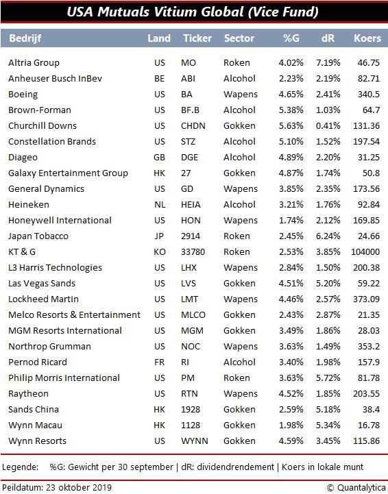 Het kan daarom interessant zijn om die foute aandelen eens nader te bekijken. Onderstaande tabel biedt inzage in de 25 grootste posities van het Vice Fund. Samen goed voor een gemiddeld dividendrendement van net geen 3%.