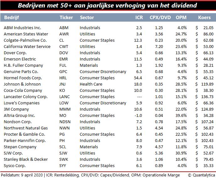 Het coronavirus mag dan wel bedrijven aanzetten tot het opschorten of schrappen van het dividend, sommige ervan gooien hun reputatie niet zomaar te grabbel. Wie een blik werpt op de lijst met bedrijven die hun dividendpolitiek hebben gewijzigd onder druk van het coronavirus, ziet dat het veelal bedrijven betreft met een kort trackrecord. Het zijn vooral bedrijven die het dividend minder dan tien jaar progressief hebben verhoogd. Op Wall Street noteren echter tientallen bedrijven met een perfecte dividendgeschiedenis van 25 jaar, de zogeheten Dividend Aristocrats. Sommige daarvan zelfs 50 jaar, en voeren de eretitel Dividend Kings.