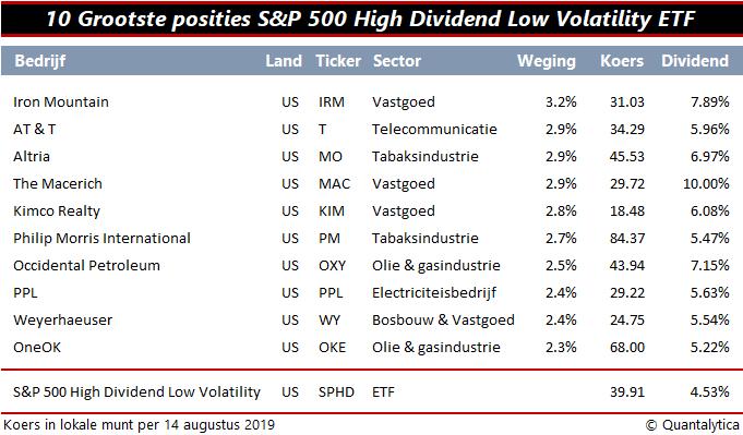 Er is voor elk wat wils. Beleggers die liever trackers kopen, kunnen terugvallen op een ETF van Invesco. Koop je liever losse aandelen of wil je weten welke aandelen onder de motorkap zitten, dan geeft onderstaande tabel de tien grootste posities van S&P500 High Dividend Low Volatility Index.