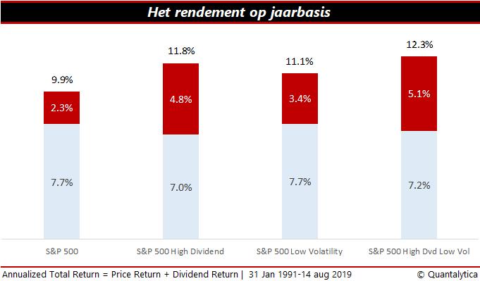 Ga je nog verder terug in de tijd, dan zie je dat de S&P500 sinds februari 1991, inclusief dividend, een rendement van 1391% heeft binnengeharkt. Aandelen met een hoog dividendrendement sprokkelden een totaalrendement van 2312% bijeen, laagvolatiele aandelen 1928%. Om een en ander beter in perspectief te kunnen plaatsen, geeft onderstaande grafiek de percentages weer op jaarbasis.