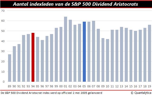 Tot slot, maar daarom niet minder interessant: de grafiek met het aantal indexleden van de S&P 500 Dividend Aristocrats per jaar.