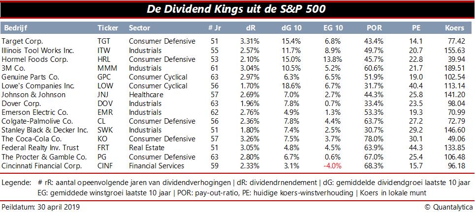 Beleggers die louter in de S&P 500 Dividend Aristocrats willen investeren, kunnen dit eenvoudig doen door een indextracker aan te schaffen. Ben je echter uitsluitend geïnteresseerd in de zogeheten Dividend Kings, dan moet je ze los kopen. De aanschaf van individuele aandelen kan evenwel aardig in de papieren lopen, maar you only need the best. Maar de beste aandelen, maar welke zijn dat? Qua historische dividendgroei is dat Lowe’s, qua dividendrendement winkelketen Target en qua payout-ratio de verzekeraar Cincinnati Financial. Al zijn het Dividend Kings, aandelen beoordeel je altijd vanuit verschillende invalshoeken. Dus je kijkt op ’n minst ook naar de koers/winstverhouding en de winstgroei.
