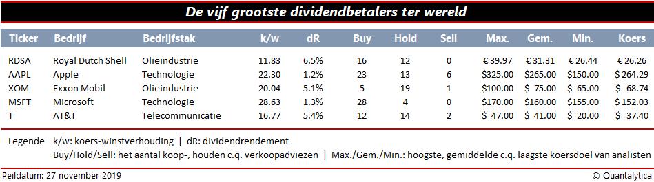 Janus Henderson stelt om de drie maanden een lijst samen met de grootste dividendbetalers van het afgelopen kwartaal. Ook zette de Britse vermogensbeheerder recentelijk nog de grootste betalers van de afgelopen zeven jaar op een rij. Het overzicht wordt gedomineerd door Amerikaanse bedrijven. Maar wat schetst onze verbazing: Royal Dutch Shell is al drie jaar op rij de grootste. De top-5 bestaat voorts uit Apple, Exxon Mobil, Microsoft en AT&T. De vijf grootste dividendbetalers ter wereld zijn precies goed voor 5% van het totale bedrag aan dividenden wereldwijd.