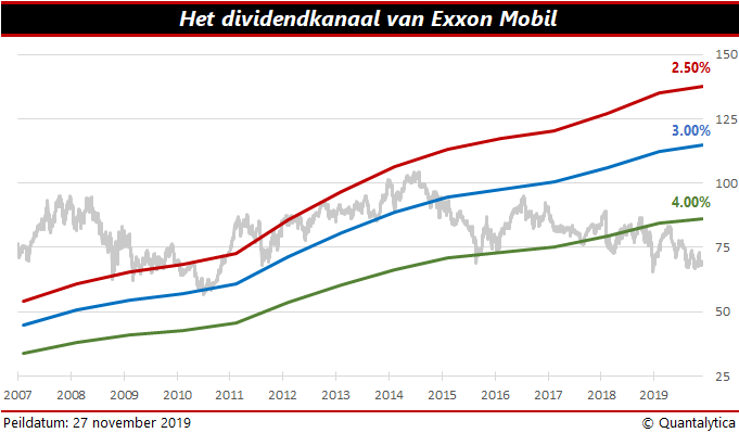 Het derde aandeel uit de reeks van grootste dividendbetalers is Exxon Mobil. De Amerikaanse oliemaatschappij voert al 37 jaar een progressief dividendbeleid. Het aandeel wordt gerekend tot de Dividend Aristocrats. Dat is een selecte groep van aandelen die het jaarlijkse dividend minimaal 25 jaar lang hebben verhoogd.