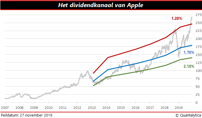 De laatste jaren profileert Apple zich steeds meer als een aandeel met een progressief dividend. In 2012 hervatte het Amerikaanse computerbedrijf zijn dividenduitkeringen, nadat deze in 1995 waren stopgezet.