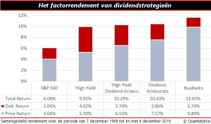 Wie een blik werpt op het rendement van verschillende dividendstrategieën, ziet dat inkoop de hoogste opbrengst biedt – ongeacht of u kijkt naar het totaalrendement of naar de koersontwikkeling. Hiervoor zijn drie redenen aan te wijzen. Inkoop ondersteunt de beurskoers omdat het vaak om grote bedragen gaat. Omdat naast het grote publiek ook het bedrijf aandelen inkoopt, is er extra vraag en stijgt de koers gedurende het inkoopprogramma. Daarnaast is er het fiscale aspect. Van elke euro dividend gaat 15 cent naar de belastingdienst. Maar inkoopprogramma’s worden niet belast. En na een inkoopprogramma stijgt de winst per aandeel, omdat de meeste bedrijven de ingekochte aandelen vernietigen. De winstgroei die daaruit voortvloeit, sorteert een positief effect op de beurskoers. Bedrijven krijgen hierdoor extra ruimte om het dividend verder te verhogen.