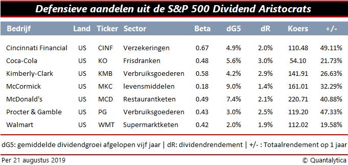 In de praktijk komen zij al snel uit bij de indexleden van de S&P500 Dividend Aristocrats. Over het algemeen zijn dit bedrijven van wereldfaam. Daarnaast hebben zij de naam om de markt door dik en dun te verslaan. Het zijn vooral aandelen van defensieve bedrijven met een progressief dividendbeleid. Denk aan namen als Cincinnati Financial, Coca-Cola, Kimberly-Clark, McCormick & Co, McDonald’s, Procter & Gamble en Walmart. Dit zijn koninklijke dividendaandelen die het laatste tijd duidelijk beter doen dan de markt.