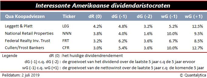 Onderstaande tabel somt vier Amerikaanse dividendaristocraten op met een hoog dividendrendement. Ook steeg in de afgelopen vijf jaar de winst sneller dan het dividend, dat op zijn beurt sneller steeg dan in de vijf ervoor. En daarnaast verwachten analisten dat de nettowinst in de komende vijf jaar harder zal stijgen dan in de afgelopen vijf jaar.