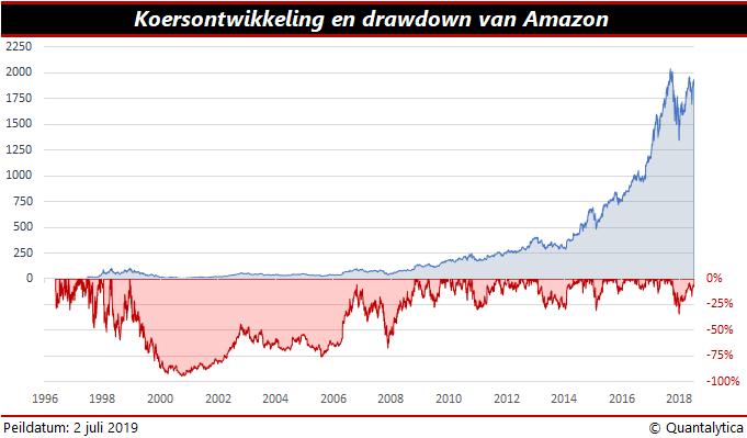 Als je de grafiek van Amazon erbij neemt, dan zie je dat de tussentijdse koersverliezen soms ver kunnen oplopen. Er zijn weinig beleggers die van begin af aan de aandelen van de onlineretailer hebben aangehouden. Met het knappen van de internetzeepbel implodeerde de koers van Amazon met 94,4%. Dat is geen kattenpis, maar het jaarrendement van 38,2% is ook niet mis.
