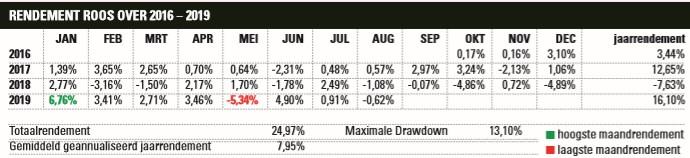 De portefeuille van Roos verloor 0,6% aan waarde. Ze kan er niet mee zitten, want Roos heeft nog steeds de best presterende beleggingsportefeuille van alle verschillende ijkpersonen. Het gemiddelde jaarrendement van 8,0% ligt een stuk hoger dan de 6,3% van Floris (die het meeste risico loopt en daardoor het hoogste rendement zou moeten behalen). Roos denkt dat de huidige technologische revolutie vooral uit de VS komt. Daardoor zullen Amerikaanse aandelen in haar ogen hun hoge koersen lang blijven vasthouden.