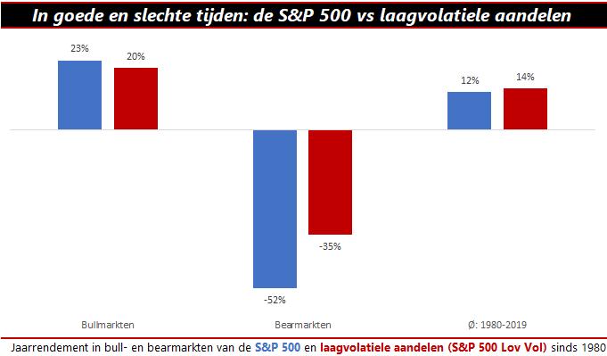 Beleggers met een uitgesproken afkeer van risico, laten bij voorkeur hun oog vallen op laagvolatiele aandelen. Bij correcties dalen aandelen met kleine koersschommelingen namelijk vaak minder hard. Als de beurzen eenmaal herstellen, hebben laagvolatiele aandelen daardoor ook minder goed te maken. Niettemin kunnen zij in bullmarkten het beursgemiddelde niet bijhouden. Daar staat dan weer tegenover dat laagvolatiele aandelen door de marktcyclus heen met een lager risico een hoger rendement bijeen sprokkelen.