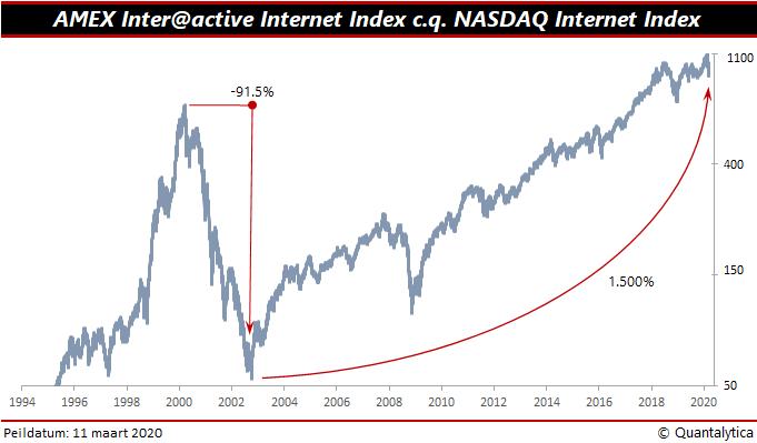 Nog indrukwekkender was de koersimplosie die daarop volgde. Eind 2000 stond de internetindex terug op het peil van 1999, en in de negen maanden erna leverde de graadmeter nog eens 64% in. Per saldo denderde de index 92% omlaag!