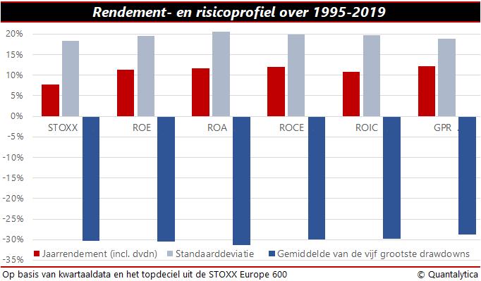 Voor alle bovenstaande rendementsratio’s geldt: hoe hoger, hoe beter. Uit de vergelijkende test met Europese aandelen komt de brutowinstratio als winnaar uit de bus. Tussen 1995 en 2019 harkte deze techniek niet alleen het hoogste samengestelde jaarrendement binnen, het deed dit ook met het laagste risico. Dat blijkt uit de volatiliteit of de tussentijdse drawdowns.