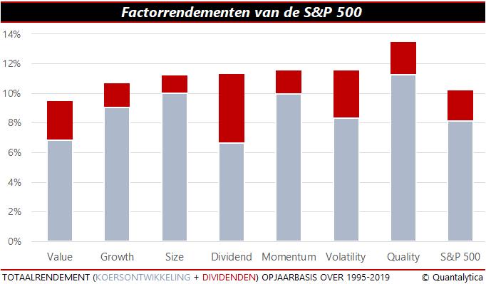 Door de jaren heen bieden kwaliteitsaandelen een hoger rendement dan groeiaandelen of welke mono-factor dan ook. Een blik op de Quality-index van de S&P500 leert dat op Wall Street het samengestelde jaarrendement van kwaliteitsaandelen in de periode van 25 jaar tot aan 2019 uitkomt op 13,5%. Dat is duidelijk beter dan het jaargemiddelde van de S&P500 en andere mono-factoren, waaronder de S&P500 Growth-index.