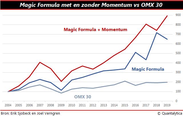 In de periode van vijftien jaar tot aan maart 2019 genereerde de originele versie van de Magic Formula een jaarrendement van 13,3% tegenover 4,7% voor de OMX30, de Zweedse hoofdindex. De magische aandelen met momentum doen daar met een jaargemiddelde van 15,7% niet alleen een schep bovenop, het risico is ook nog eens lager.