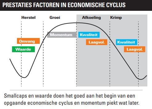 Volgens de theorie hangen de prestaties van verschillende factoren af van de economische cyclus. Zo zouden smallcaps (size) en waardeaandelen het goed doen aan het begin en momentum juist wat later in een opgaande economische cyclus. Low vol- en kwaliteitsaandelen presteren doorgaans relatief goed in de neergaande cyclus. Dat roept de vraag op of we met factortiming of met ‘discounts’ als timingsindicatoren extra rendement kunnen maken. Zijn bijvoorbeeld smallcaps of kwaliteitsaandelen relatief goedkoop, historisch of versus de andere factoren, dan krijgen ze meer gewicht versus relatief ‘dure’ factoren.
