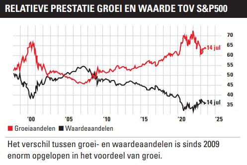 Maar waarom horen we de laatste jaren eigenlijk weinig meer van factorbeleggen? Ook daarvoor zijn grofweg drie oorzaken. Ten eerste de populariteit van de grote technologieaandelen. Dat speelt de meeste factoren parten, met uitzondering van momentum. Vooral het smallcap- en waarde-effect hebben er last van. Per saldo legt een portefeuille die belegt in vier of vijf factoren het de laatste jaren af tegen de gewone beurswaardegewogen index. Vooral het verschil tussen groei- en waardeaandelen is sinds 2009 enorm opgelopen in het voordeel van groei (zie figuur).