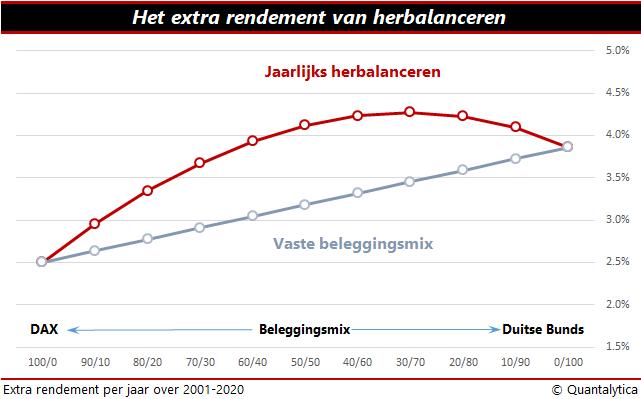 Historische simulaties over periodes van twintig jaar tonen aan dat het effect van herbalanceren het grootste is bij een beleggingsmix van 60/40. Het extra rendement van referentieportefeuilles kan oplopen tot wel 1 procentpunt per jaar. Over de afgelopen twintig jaar konden Amerikaanse beleggers door herbalanceren 0,5 procentpunt extra rendement per jaar maken, en Europese beleggers 0,8 procentpunt.