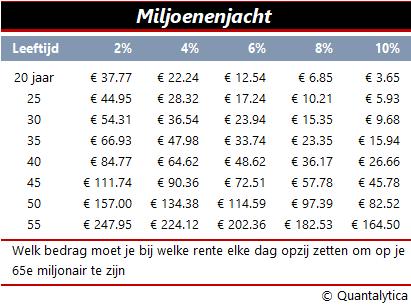 Het bedrag dat u opzij moet zetten om miljonair te worden verschilt naargelang de rekenrente en de looptijd. Als je op je 20ste begint en je realiseert jaar in jaar uit een rendement van 10%, dan volstaat nog geen €4 per dag. Op je 25ste is dat al €6. Je belegt dan elke maand €180. Bij een jaarpercentage van 6% moet u elke dag €17 opzij zetten.