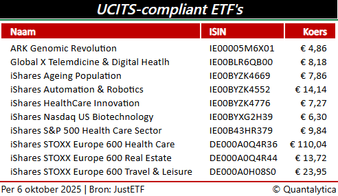 Beleggers die in de vergrijzing willen investeren, komen snel uit bij zorgvastgoed en geneesmiddelen, maar ook binnen de reisbranche en de technologiesector vind je interessante beleggingen. Met aandelen investeer je gericht, met zogeheten trackers, oftewel Exchange Traded Funds (ETF’s), doe je dat gespreid. Middels een tracker gericht op innovatieve gezondheidszorg, vrije tijd en recreatie of woonzorgcentra, beleg je gespreid in het thema. Iedere tracker heeft haar eigen beleggingsstrategie en de ene ETF is meer gespreid dan de andere, zowel in posities, weging als geografie.