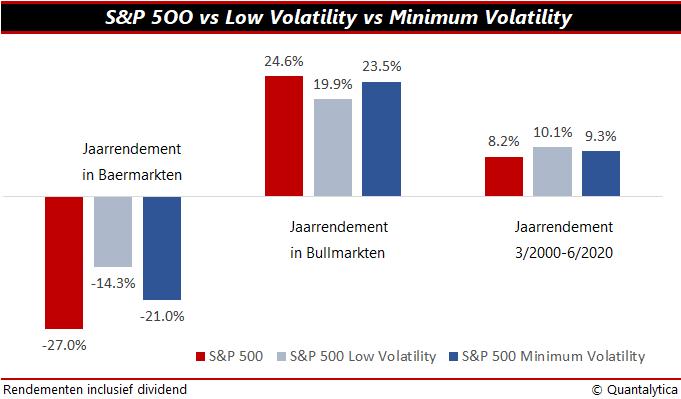 Wat kunnen beleggers die hun slapende spaartegoeden alsnog willen activeren leren van de prestaties in de afgelopen jaren? Wel, laagvolatiele beleggingen deden het in de voorbije twintig jaar beter dan aandelen met minimale volatiliteit en overklasten de S&P500 ruim. Tijdens beweeglijke periodes bleef het verlies beperkt en in de tussenliggende bullmarkten presteerden ze ook redelijk goed.
