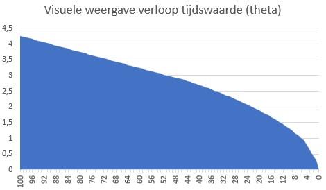 Ook de looptijd van een optie is van invloed op de hoogte van de theta. We verduidelijken dit met een voorbeeld. In de grafiek zien we een at-the-money-optie met een uitoefenprijs van $100 en een impliciete volatiliteit (verwachte beweging) van 20%. De optie in fictieve voorbeeld heeft een looptijd van honderd dagen. In de eerste vijftig dagen verliest de optie $1,28 aan tijdswaarde en in de laatste vijftig dagen $2,98. Hoe dichter een optie bij het einde van de looptijd komt, hoe sneller de tijdswaarde die nog in de optie aanwezig is eruit loopt. Dit is een gebruikelijk patroon bij opties. Het resulteert in een hogere theta naarmate de expiratiedatum in zicht komt.