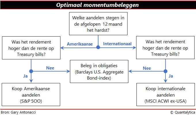 Zijn methode is simpel. Eerst wordt het momentum van Amerikaanse aandelen vergeleken met dat van buitenlandse aandelen. Als de S&P500 in de voorbije maand relatief beter presteerde dan niet-Amerikaanse aandelen, valt de keuze op de S&P500. Zo niet, dan op de MSCI Wereldindex exclusief de VS. Vervolgens kijkt Antonacci of het rendement hoger is dan dat van de Bloomberg Barclays U.S. Aggregate Bond-index. Als het absolute momentum van de bedrijfsobligaties hoger is, gaat de voorkeur uit naar Amerikaanse bedrijfsobligaties. Zo niet, dan naar de best presterende aandelencategorie.