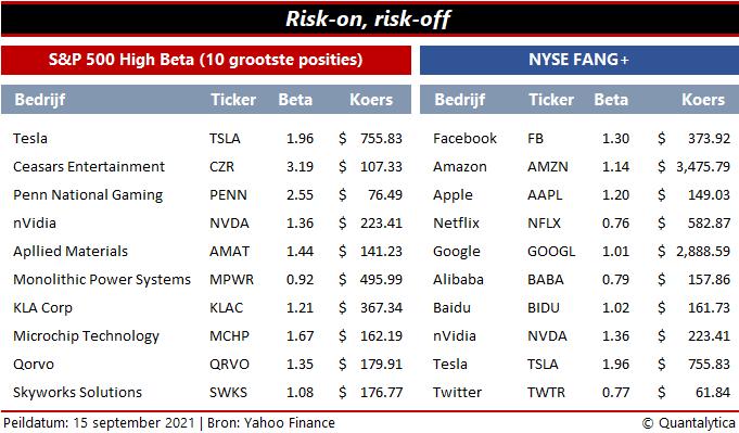 Als de risicobereidheid van beleggers omslaat naar risk-off, dan zal dat zeker tot uitdrukking komen in het koersverloop van de FANG+-index en bij aandelen met hoge bèta’s. Een stevige dip bij de hippe FANG-aandelen is extra relevante informatie. Ze namen de voorbije jaren bij elke correctie het voortouw bij het beursherstel.