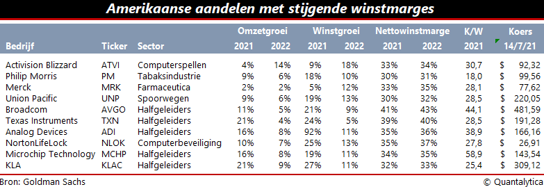 Onlangs schreef David Kostin, strateeg bij Goldman Sachs, in zijn nieuwsbrief dat beleggers er goed aan doen aandelen te kopen van bedrijven met bovengemiddeld stijgende winstmarges. In de Verenigde Staten waart niet alleen het inflatiespook rond, er loeren ook belastingverhogingen. Die twee zaken hollen de koopkracht van de eindconsument uit en ze drukken het prijszettingsvermogen van bedrijven. Nu al ziet Kostin dat bedrijven met stijgende winstmarges het beter doen dan de markt.