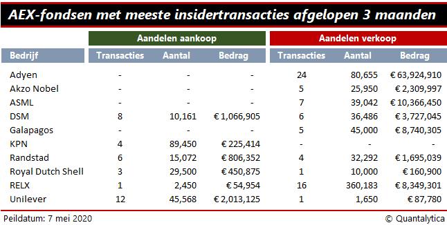 Onderstaand overzicht toont de Nederlandse hoofdfondsen met de meeste insidertransacties in de afgelopen drie maanden. Insiders mogen naar believen hun aandelen kopen of verkopen, alleen niet in zogeheten gesloten periodes. Dat zijn de 30 dagen voor de publicatie van financiële resultaten zoals de jaarcijfers en kwartaalrapportages. In dit verband is het interessant om te weten dat een topman van Shell onlangs kort na de onverwachte verlaging van het dividend aandelen Shell heeft gekocht. <