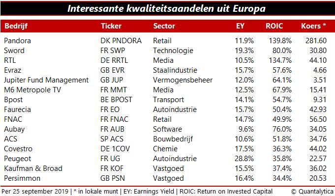 Een punt is wel dat het bedrijfsresultaat, de ondernemingswaarde en de netto-ingezette middelen bij Europese bedrijven niet voor het oprapen liggen. Naar Europa vertaald levert de magische formule vijftien interessante fondsen op: