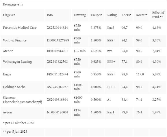 Een effectief rendement van 4,5% is nog steeds vrij laag, afgezet tegen de hoge inflatie in Nederland van 5,7% in juni. Het gaat echter om de inflatieverwachtingen en die zijn nauwelijks veranderd. In de VS en Duitsland houden beleggers voor de komende tien jaar rekening met een gemiddelde jaarlijkse inflatie van respectievelijk 2,25 en 2,33%. Zo bezien bieden de getipte solide bedrijfsobligaties een mooi positief reëel rendement. Dit temeer omdat de wanbetalingsrisico’s onder het achttal erg klein zijn. Zeven koopadviezen blijven daarom staan, de obligatie van Atenor krijgt in afwachting van een claimemissie een houdadvies. Ik bespreek kort de relevante ontwikkelingen bij de emittenten en de belangrijkste kenmerken van de leningen.
