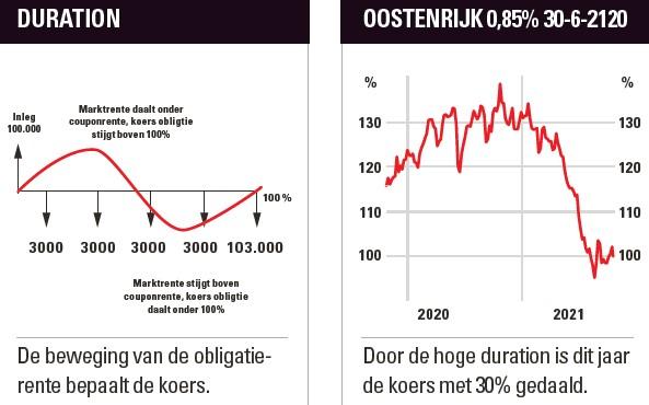 Het effect van de recent opgelopen obligatierentes in de eurozone wordt duidelijk zichtbaar als we kijken naar de koersontwikkeling van de 100-jarige obligatie van Oostenrijk (zie grafiek). Door de zeer lange resterende looptijd is de duration hoog, namelijk 67. Dit betekent dat als de 100-jarige obligatierente met 0,1 procentpunt stijgt, de koers van deze obligatie met circa 6,7 procentpunt daalt. Tussen 1 januari en 9 maart steeg deze zeer lange rentevoet met ‘slechts’ 0,4 procentpunt. Maar door de hoge duration duikelde de koers met bijna 30% sinds begin dit jaar (zie grafiek).