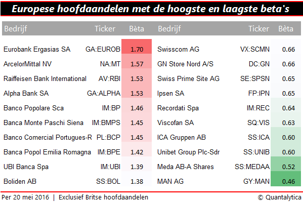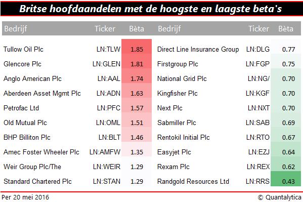 Naar gelang u verwacht of de uitslag van het Britse referendum een non-event wordt of niet, moet u aandelen met hoge bèta’s hebben of juist niet. Over het algemeen stijgen aandelen met een bèta groter dan 1 bovengemiddeld hard als de markt omhoog gaat en andersom. Deze klassieke vuistregel gaat op dit moment voor de Britse beurs niet op, waar de koersen gedreven worden door de hausse op grondstoffenmarkten.