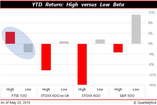 Verder valt op dat in Londen met name de aandelen met hoge bèta’s dit jaar hoge ogen gooien. Niet alleen outperformen zij hun directe tegenhangers, ze noteren ook hoger dan bij de jaarwisseling, wat niet van de defensieve aandelen kan gezegd worden en dat is opmerkelijk. De beleggingsleer postuleert immers dat in een onzeker economisch klimaat aandelen met lage béta’s de voorkeur verdienen boven hoog volatiele aandelen.