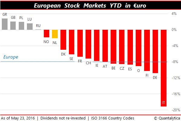 Aan de andere kant van het Europese aandelenspectrum ziet u daarentegen dat de hoofdindices in Duitsland en Italië slachtoffer zijn van hun eigen indexsamenstelling. De DAX telt relatief veel automobielbedrijven, waaronder ‘softwarespecialist’ Volkswagen, en de MIB een disproportionele hoeveelheid banken, met voorop het noodlijdende Banca Monte dei Paschi di Siena.