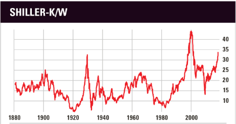 Dit scenario hoeft niet te beginnen in 2018. Het is ook mogelijk dat de Amerikaanse aandelenbeurs naar de hoogste waardering ooit gaat. Dit betekent een Shiller-k/w die hoger is dan 44,20 in december 1999.