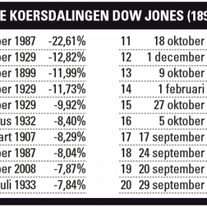 Afgelopen maandag lag het slot van de Amerikaanse Dow Jones 1175,21 punten lager dan het slot van afgelopen vrijdag. Dit was de grootste daling in punten ooit. Het vorige record stond op 777,68 punten, en dateerde van 29 september 2008.