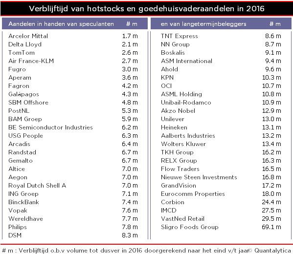 Van de AEX-fondsen mag RELX Group zich dit jaar verheugen op het trouwste beleggerspubliek. Beleggers houden hun aandelen van het mediabedrijf gemiddeld 16 maanden bij. De top-3 wordt gecompleteerd door Wolters Kluwers en Aalberts Industries, met in hun kielzog: Heineken, Unilever en AkzoNobel. Gemiddeld blijven de aandelen 13 maanden in dezelfde handen. Aan de andere kant van het spectrum heb je de hotstocks ArcelorMittal en Delta Lloyd. Zij wisselen relatief snel van eigenaar, na 35 respectievelijk 44 handelsdagen. De snelle jongens van de beurs hebben het ook voorzien op Air France-KLM, Fugro en TomTom. En aangezien we het nu toch over Midkap-aandelen en snelle jongens hebben, door de bank genomen houden beleggers hun positie in Flow Traders 16 maanden aan, maar de Midkapper dat echt in handen is van langetermijnbeleggers is Sligro Foods. De aandelen worden pas na zes jaar doorverkocht.