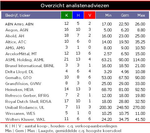 Omdat de beleggingsopninies van (zaken)banken niet voor het oprapen liggen, volgt hieronder om een en ander beter in perspectief te kunnen plaatsen het tabulair overzicht van het aantal koop-, houd- en verkoopadviezen en het gemiddelde koersdoel met de daarbij behorende extreme waarden van de aandelen die hierboven aan bod kwamen.