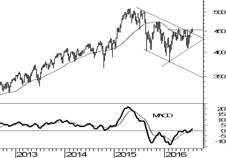 De AEX-index worstelt sinds maart dit jaar met de 450 punten, als we de Brexit-dip in juni even buiten beschouwing laten. Soms staat de AEX net iets onder de 450 punten, soms net iets erboven, maar tot op heden is de Amsterdamse index niet in staat gebleken er opwaarts afstand van te nemen. En dat is toch echt nodig om weer in aanmerking te komen voor een positief advies. Het is uiteraard wel een goede ontwikkeling dat de Brexit-dip een fors hogere bodem opleverde dan het dieptepunt in februari.