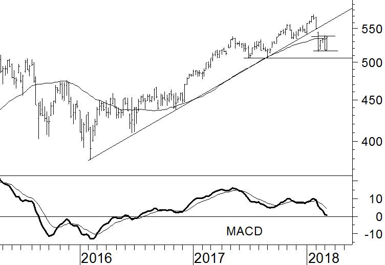 Zakt de koers onder de steun van de 515, wordt het technische plaatje brozer. Er ligt dan nog belangrijkste steun op 504/505. Als die sneuvelt, is dat een duidelijk verkoopsignaal. Het 40-weeks gemiddelde ligt nu vlak; een bevestiging dat de koers technisch stil ligt.