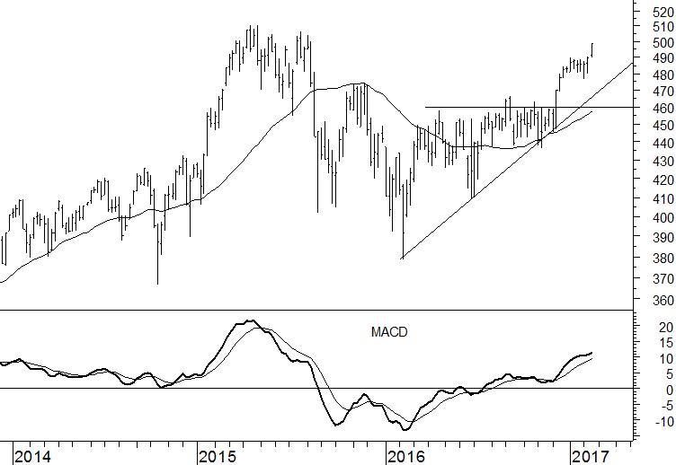 De AEX-index heeft zoals wij voorzagen de adempauze in de eerste weken van 2017 met een uitbraak aan de bovenkant afgesloten. Het positieve technische beeld krijgt daarmee de verwachte bevestiging. Rond het psychologische 500-niveau verwachten wij dit keer weinig weerstand. Belangrijker is het 510-niveau dat wordt gemarkeerd door het hoogtepunt uit 2015. Juist daar ligt de nodige interesse van beleggers om te verkopen. Vooral beleggers die eerder hebben gekocht rond 510 kunnen dan zonder verlies uitstappen.