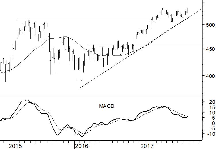 Het technische beeld van de AEX-index is uitstekend. De grotere trend is opwaarts gericht, zeker sinds in december de weerstand rond 460 werd doorbroken. De AEX gaat de uitdaging rond 538 aan.De doorbraak in maart boven 510 bevestigde de opnieuw de koopinteresse in Nederlandse aandelen. Van recente datum is de opleving vanaf hetzelfde 510-niveau. Daarover hebben wij meerdere keren geschreven.